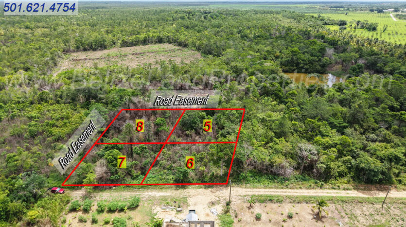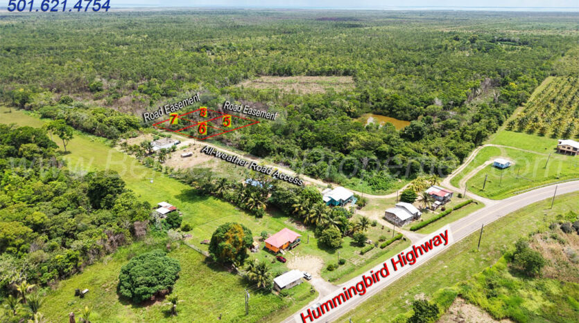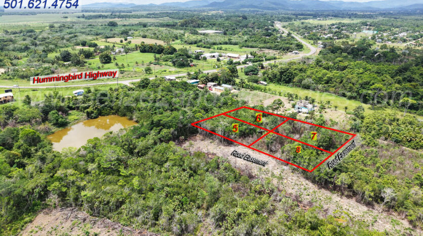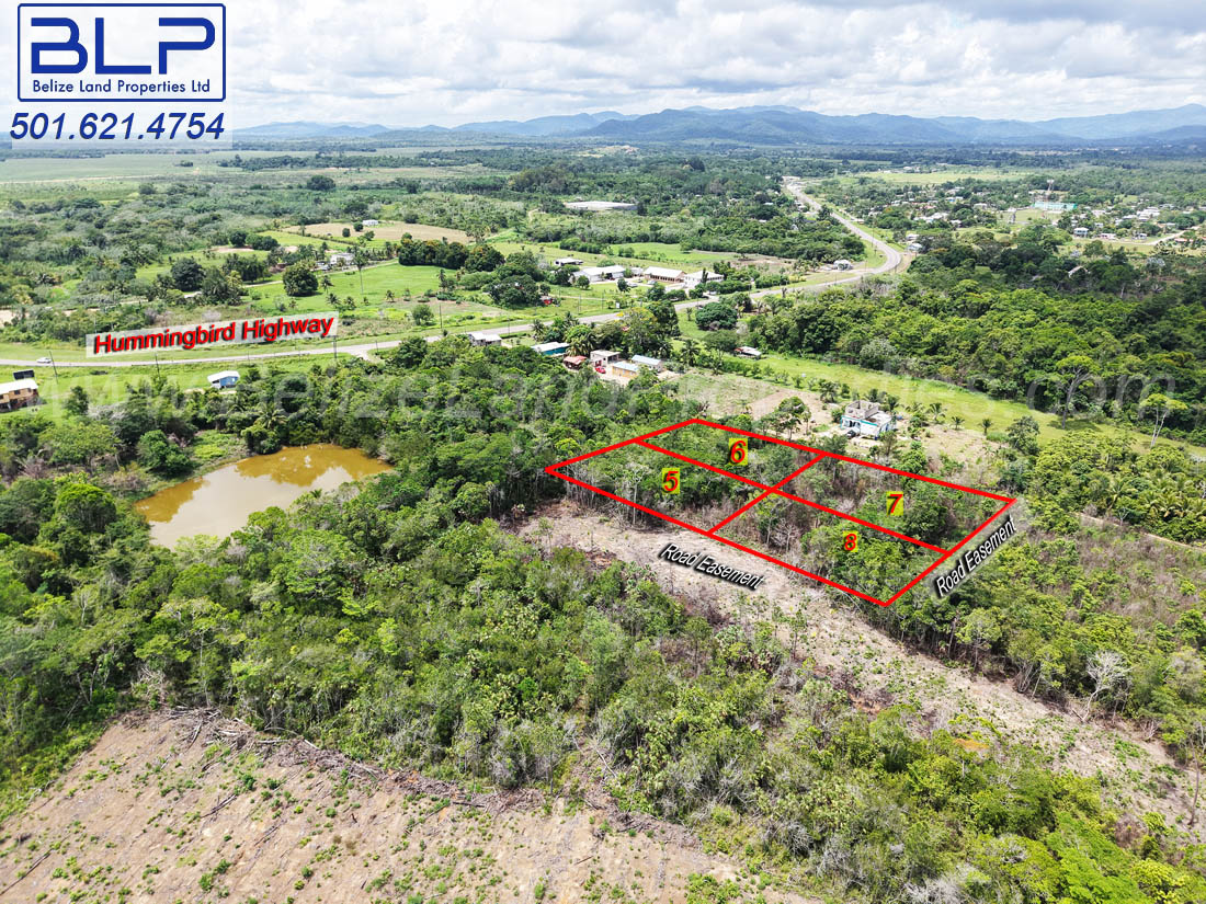 Lot 6 has existing all-weather road access and is only 650 feet away from the Hummingbird Highway. Lot 5 adjoins the back boundary of Lot 6. Additionally, Lot 5 has road easement frontage (not built yet). Electricity and potable water are available in the area