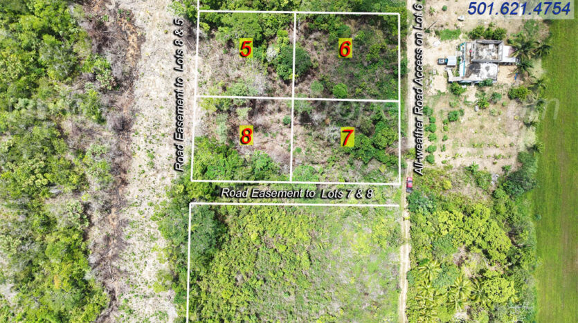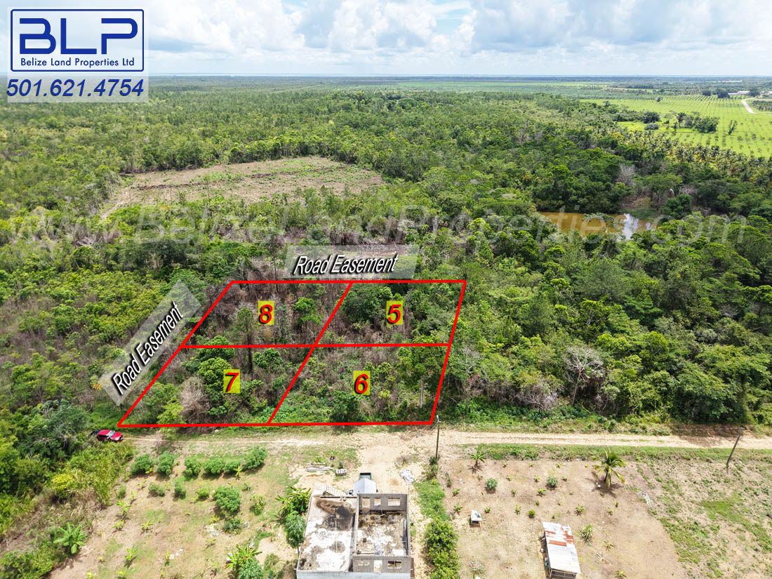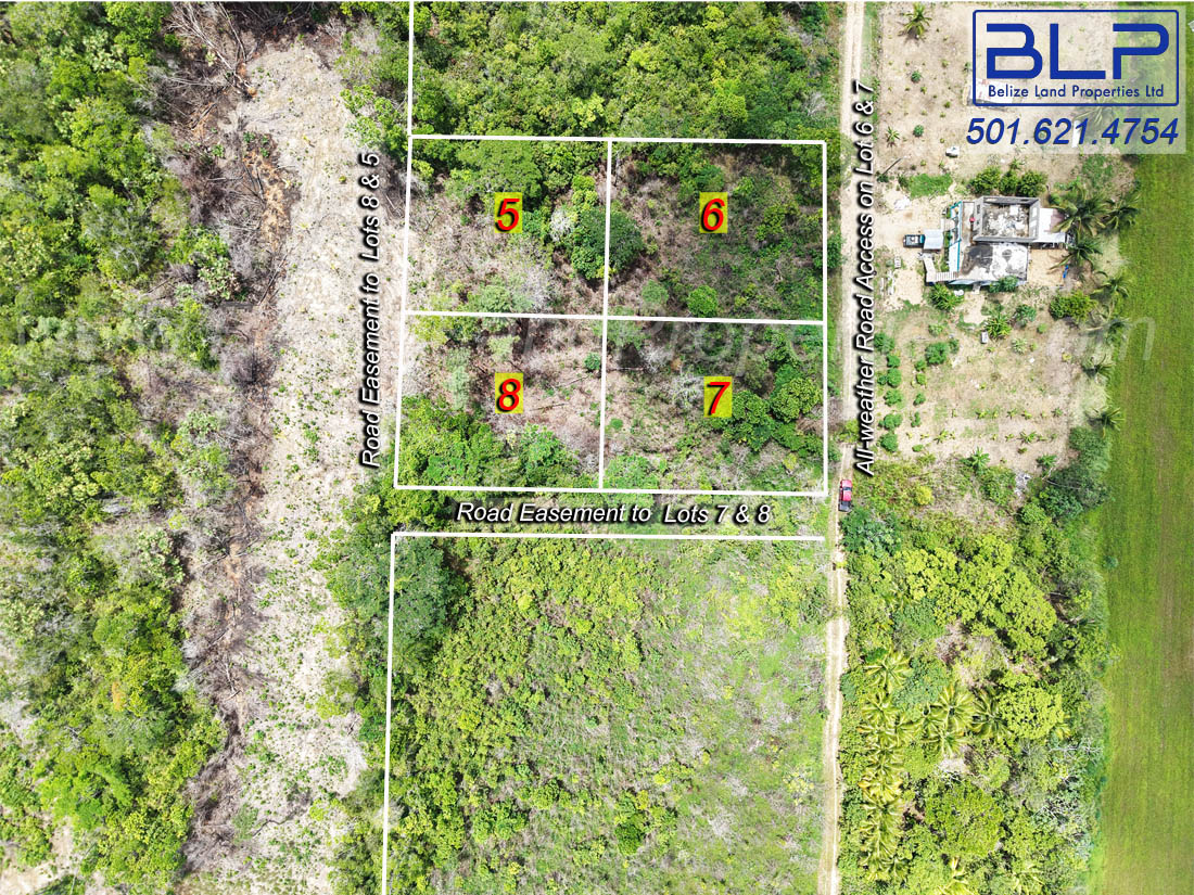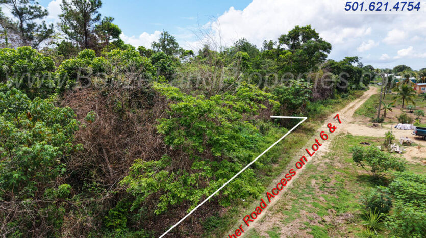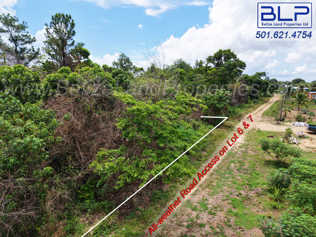 2 spacious adjoining residential lots located east of Hope Creek Village, Stann Creek District. Lot 6 has direct access to an all-weather road, whereas Lot 5 has frontage on a road easement (which is not built). In essence, each lot has road frontage.
