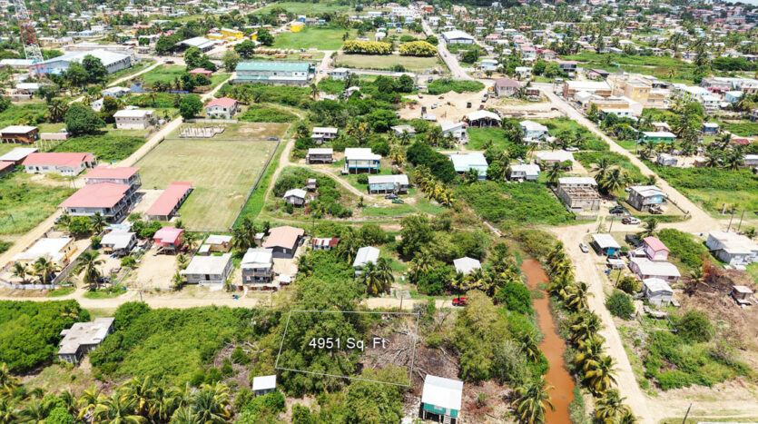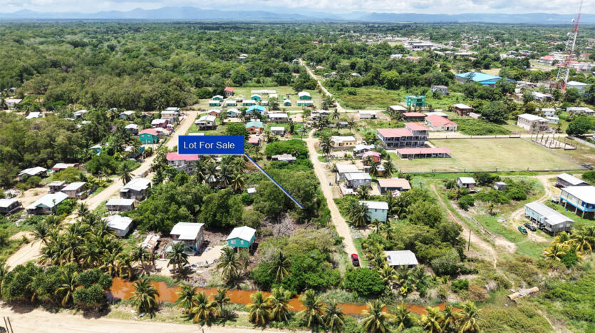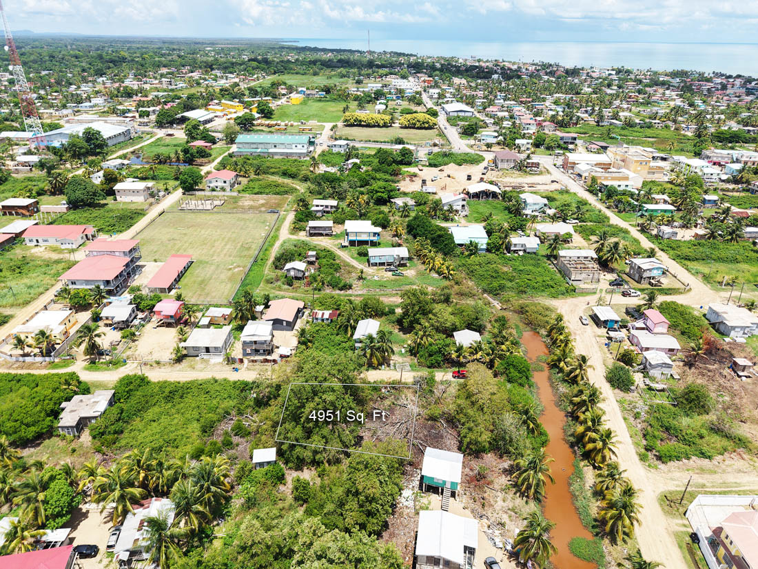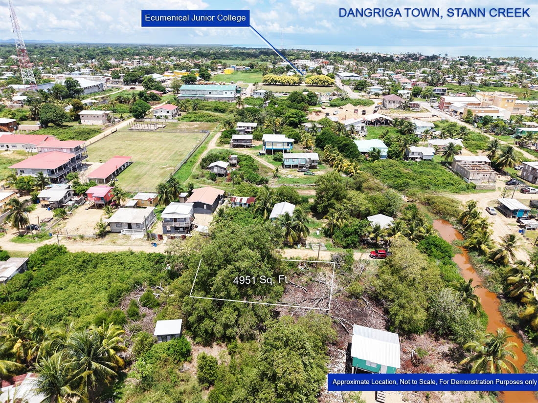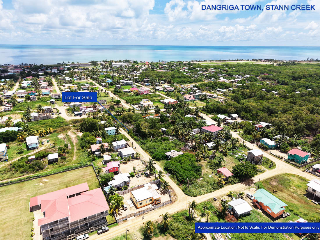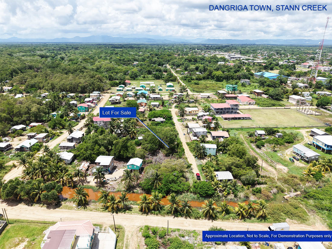 A residential lot for sale located south of the Hummingbird Highway in Dangriga Town, Stann District. The lot is in a developing area with middle-class housing, businesses and apartment buildings in the general vicinity.